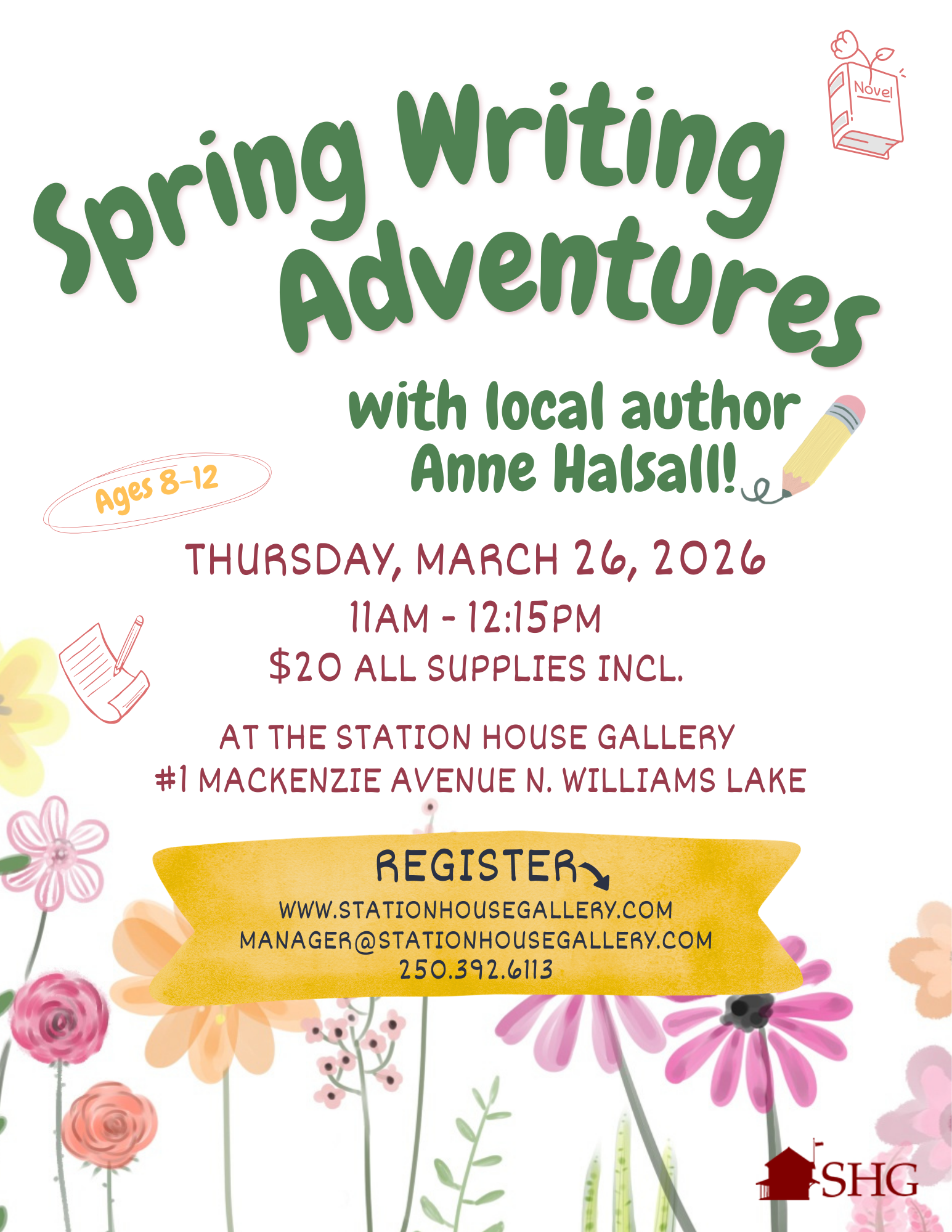 Spring Writing Adventures Spring Writing Adventures Thursday, March 26th, 2026 11am to 12:15pm Ages 8-13 $20 All Supplies IncludedPlease enable JavaScript in your browser to complete this form.Please enable JavaScript in your browser to complete this form.Parent Name *FirstLastChild/Participant Name *FirstLast of Age Additional Participants Age *Email *Numbers *I hereby consent to the taking of photographs, video and/or audio of my participation (or the participation of the minor named above) in a workshop/class by the Station House Gallery and its authorized representatives. *YesNoAny Additional InformationSubmit